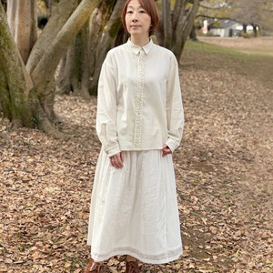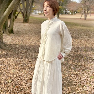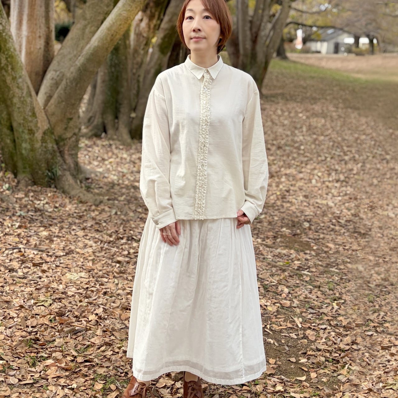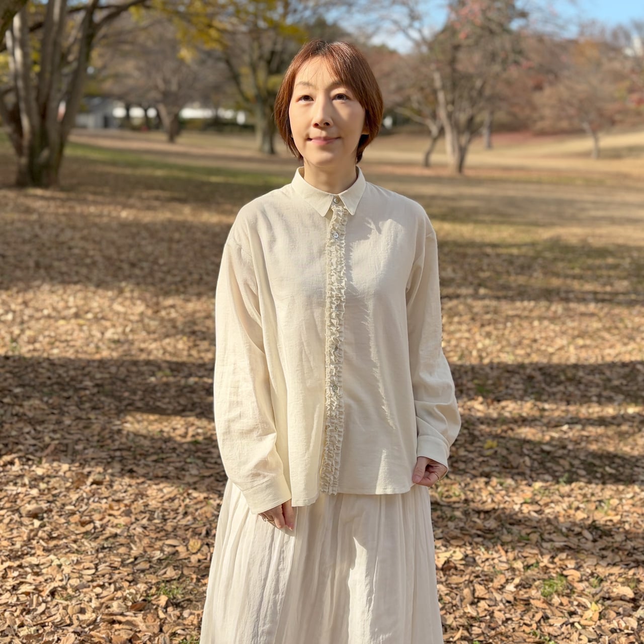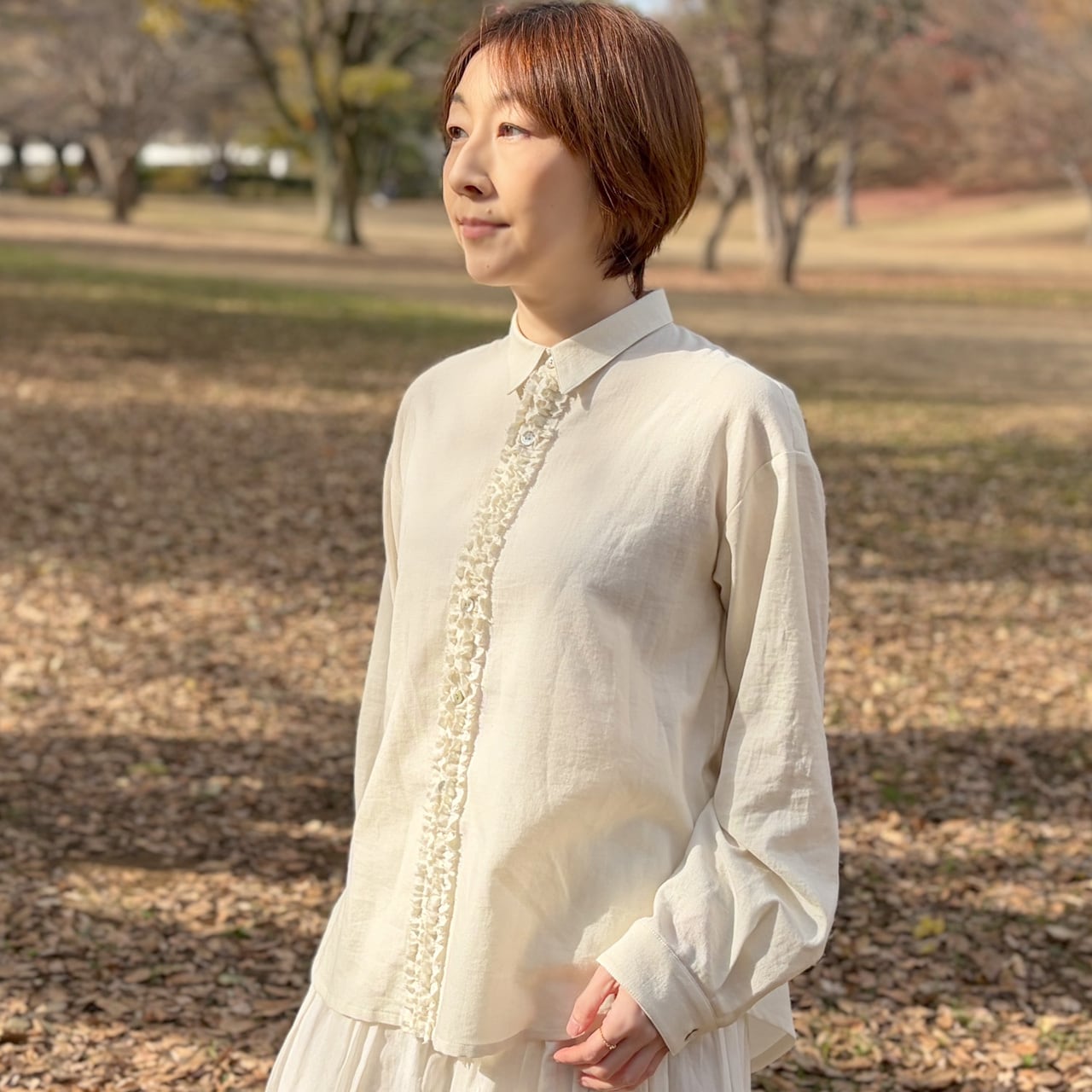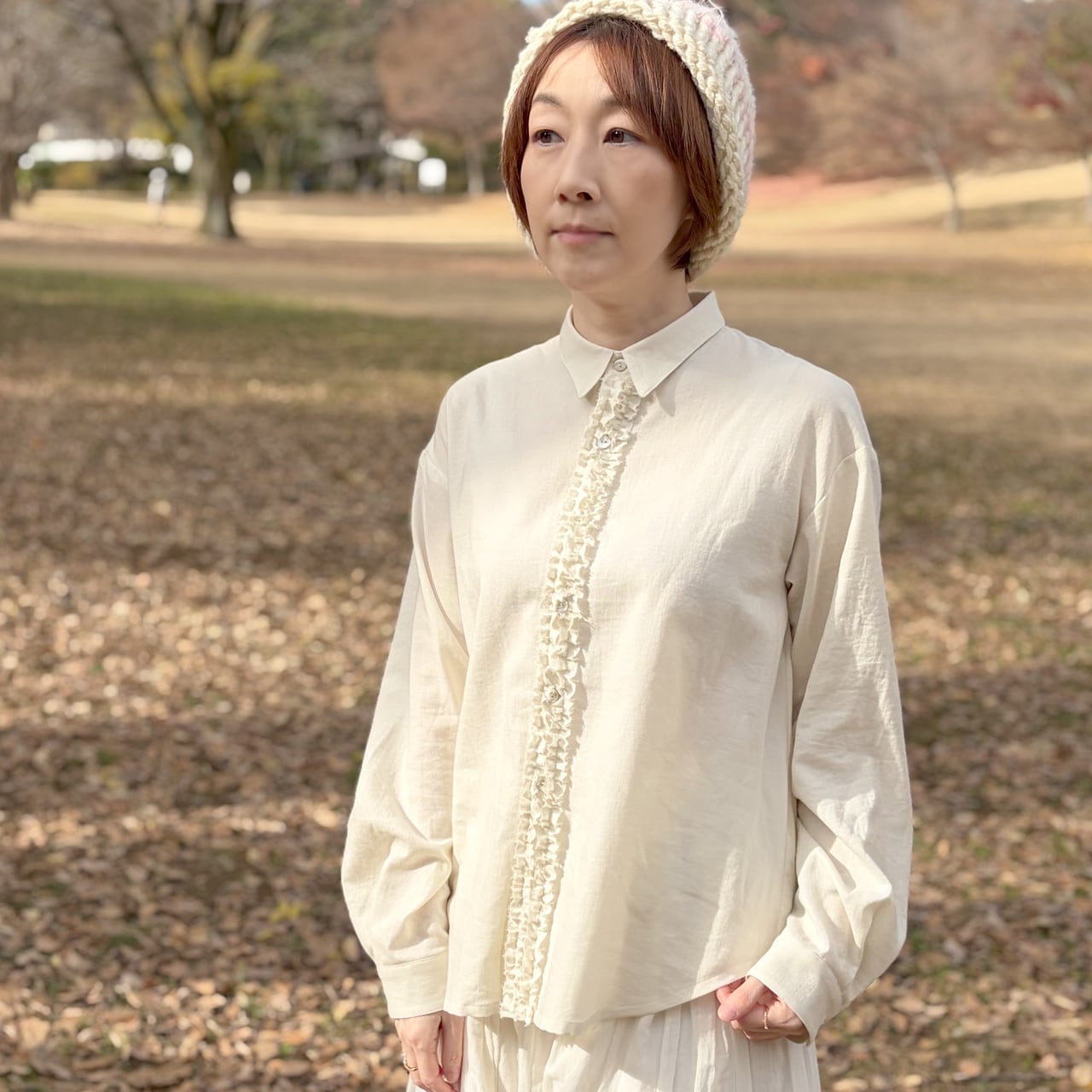 いつも活躍してくれる、少しきちんと感のあるシャツに、前立てにフラジールフリルをつけて、派手過ぎないデザインポイントに!