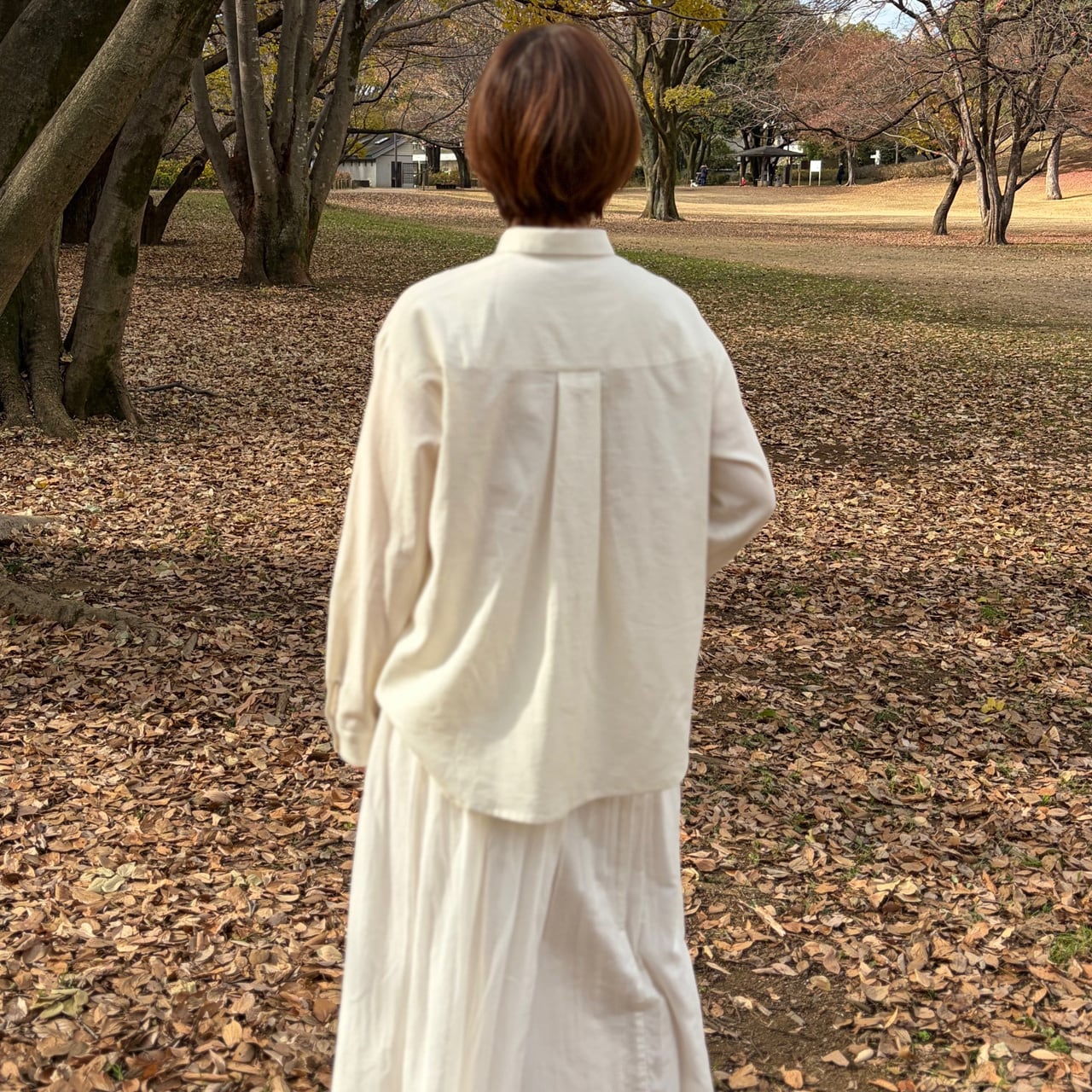 ☆前は少し短く、後ろはやや長め64㎝、ヒップが少し隠れて、気にならない丈に仕上げてありますので、そのままアウトにしてもスタイルが決まりやすく、インにしてもスッキリとバランスがとれるブラウスです。
