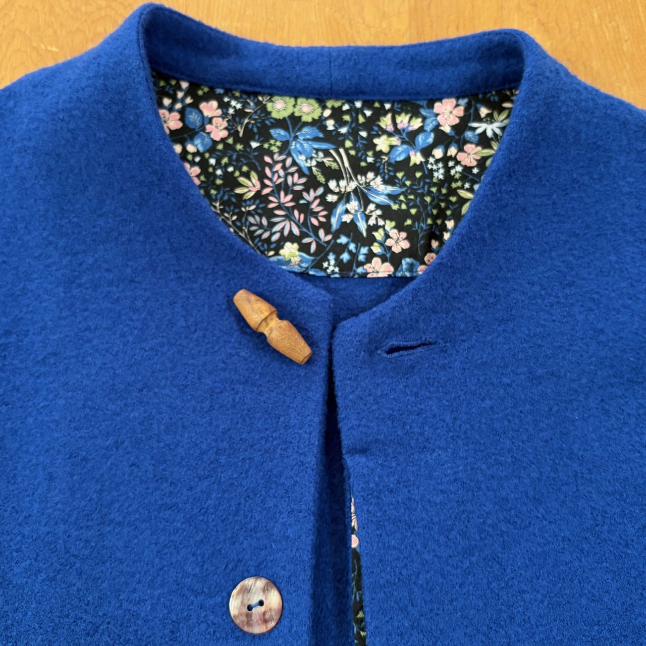 後ろ襟ぐりは少しスタンドカラーから、前側はネックに沿ったノーカラーでスッキリと見えます。