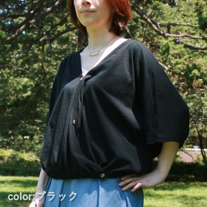 袖丈は肘の隠れる6分袖、冷房対策にもOKですが、暑さにもアームがゆったりとして風通しがよく、薄手羽織ものとして、夏から秋にかけてヘビロテアイテムとなるでしょう。