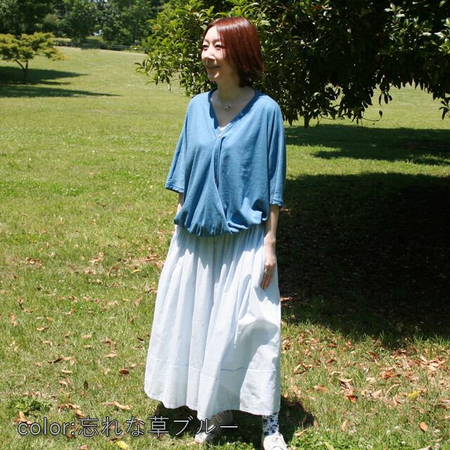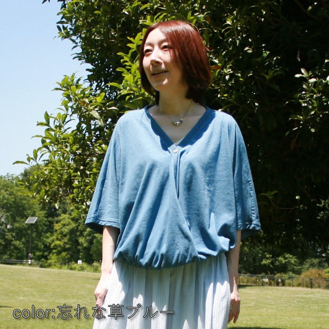 濃いめの忘れな草のブルーです。ホワイトのボトムにも合わせやすいですが、濃いめのデニムにも良くなじみます。少し杢調ですのでナチュラルな仕上がりです。