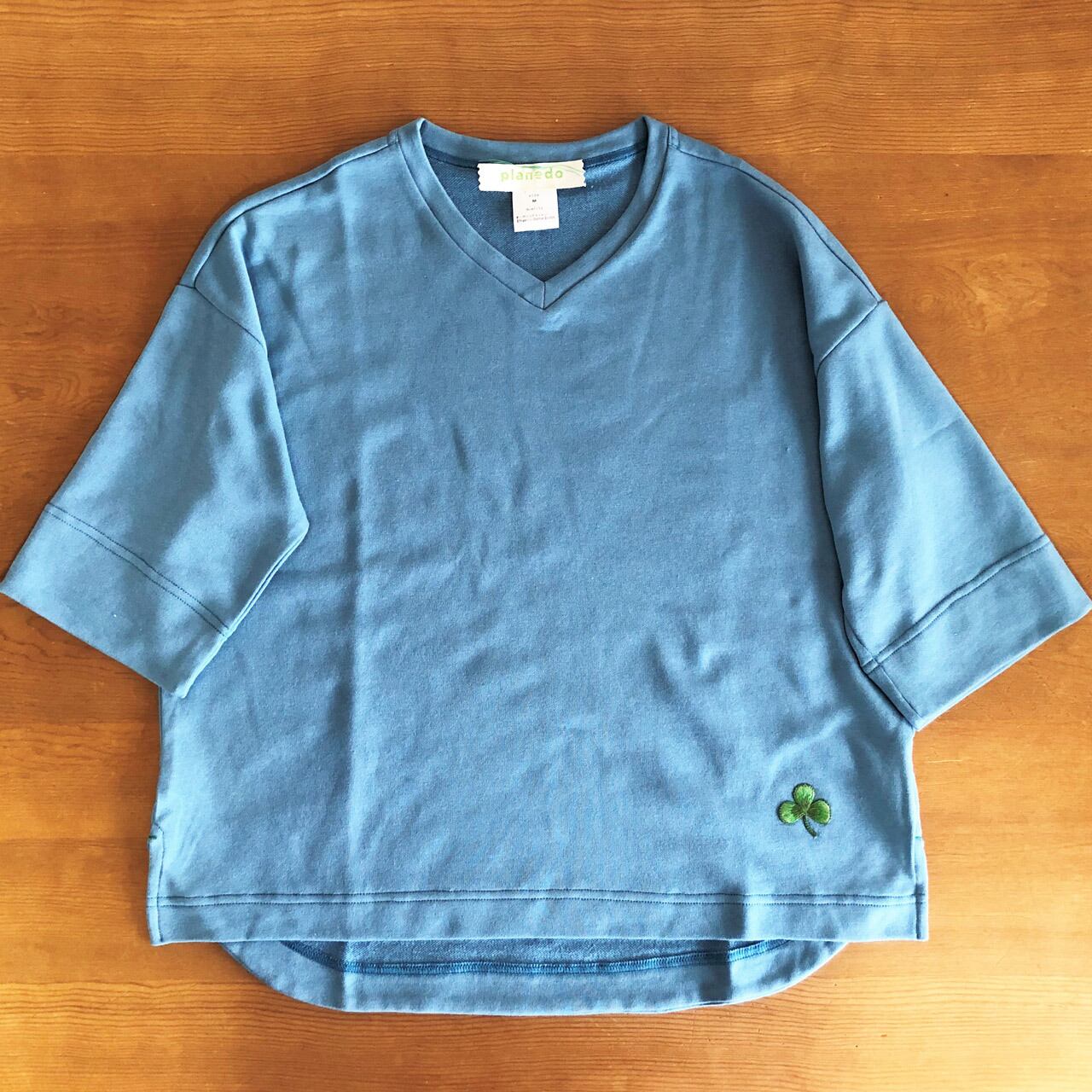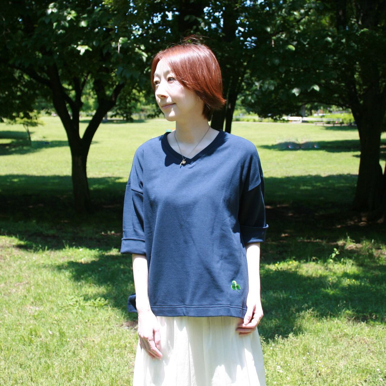 柔らかく肌ざわりの良いオーガニックコットンミニ裏毛で、Vネック6分袖プルオーバーのを作りました。クローバーの刺繍アップリケがポイントです。