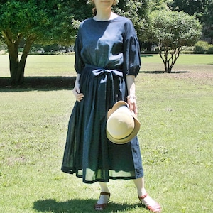 身頃もフンワリとギャザーをよせて、身体から程よく離れ、袖もフンワリとギャザースリーブがエアリーで涼しく,まさに風通る夏服です!!