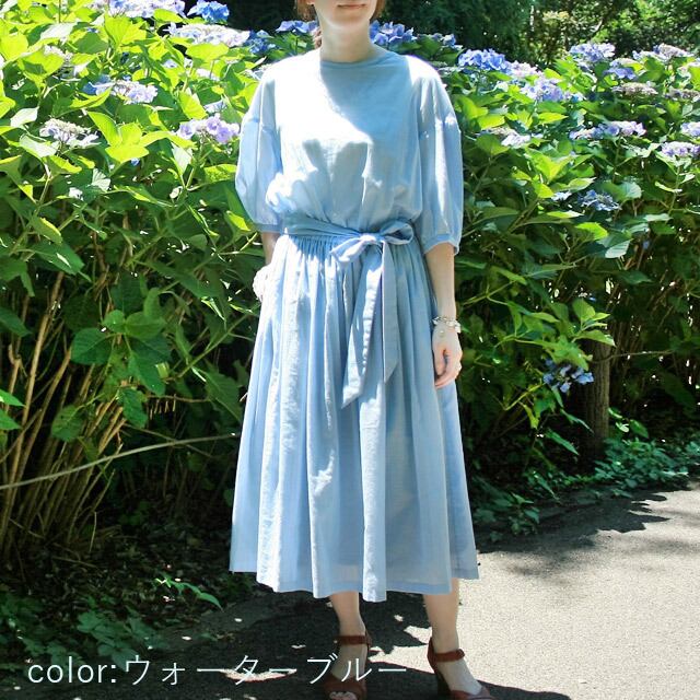 オーガニックコットンボイルでウエスト共リボン、フンワリギャザーのワンピースを作りました。