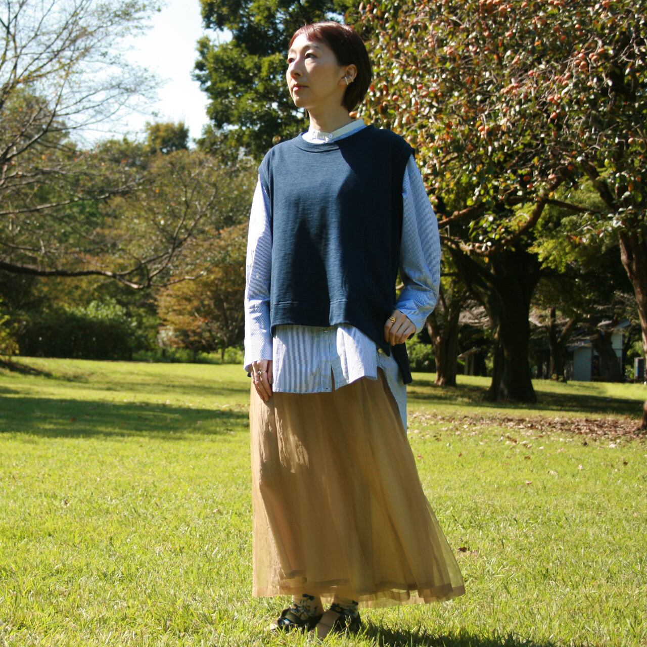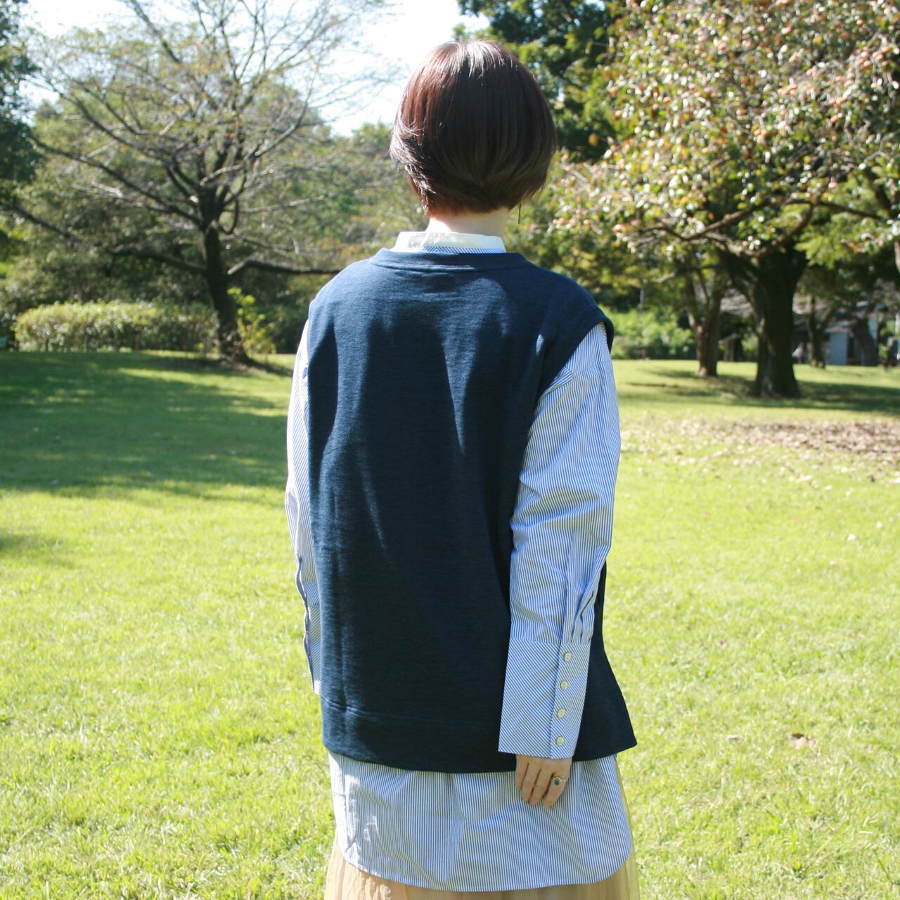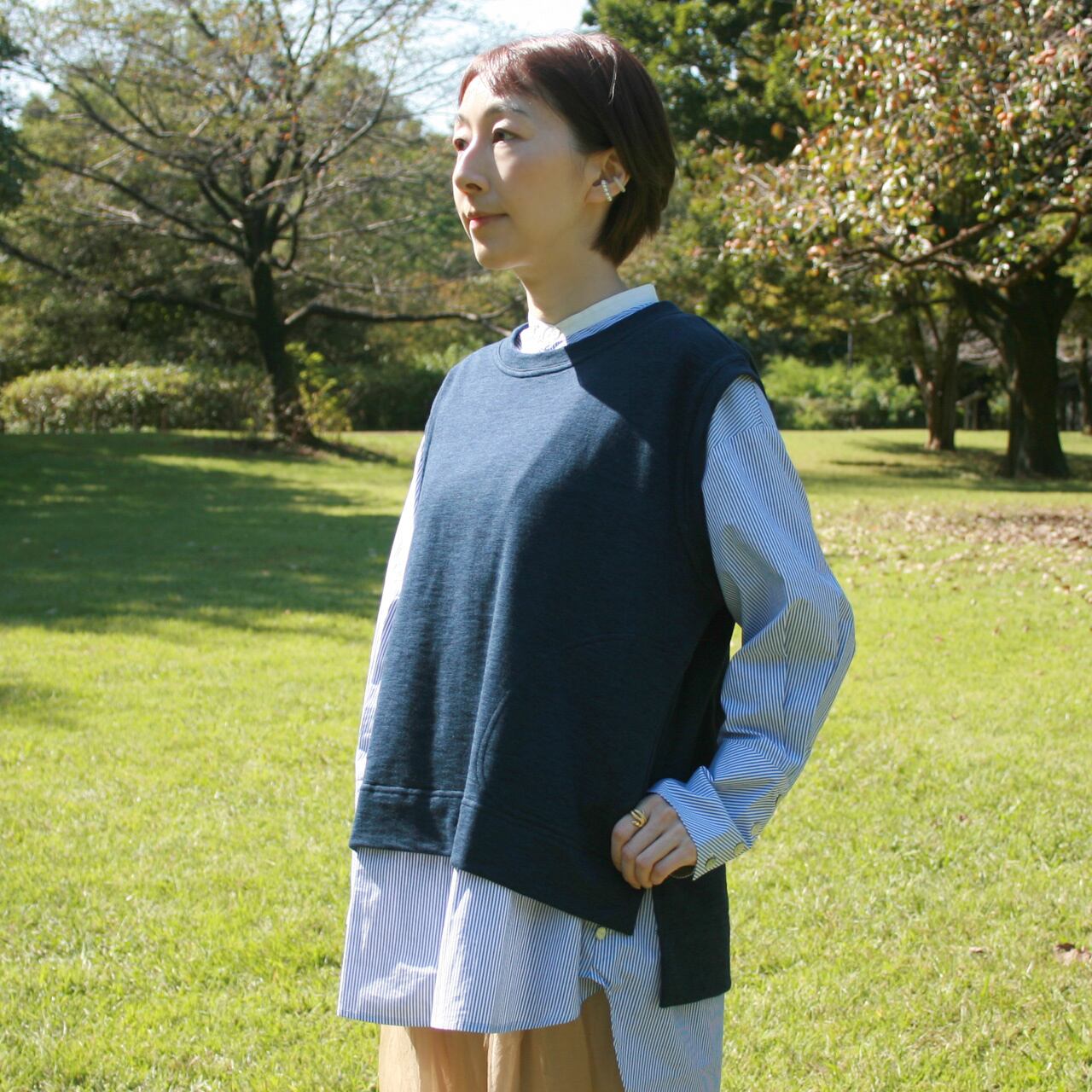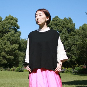 ゆったり感のあるストンとしたシルエット、中に着るアイテムを選ばないベストです。