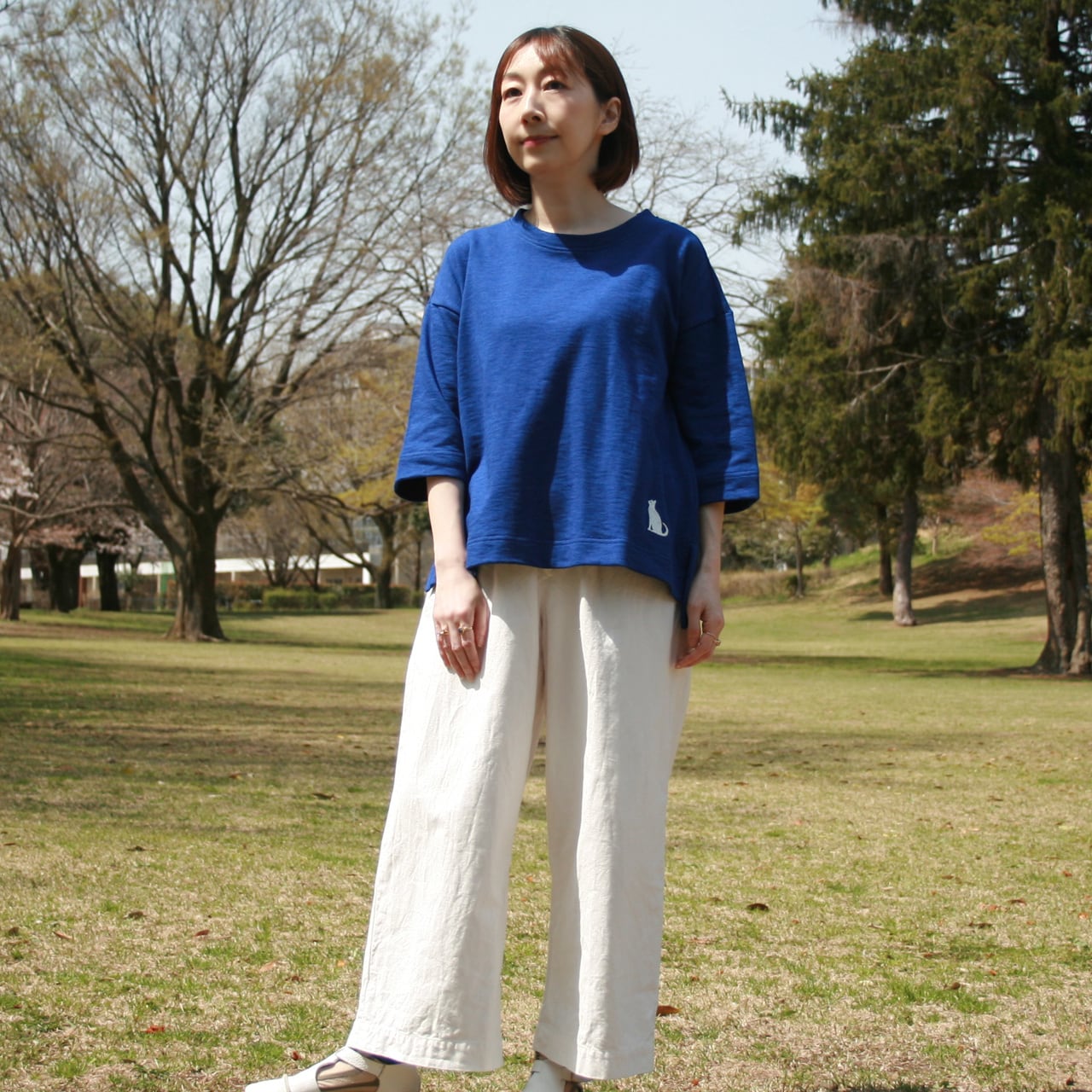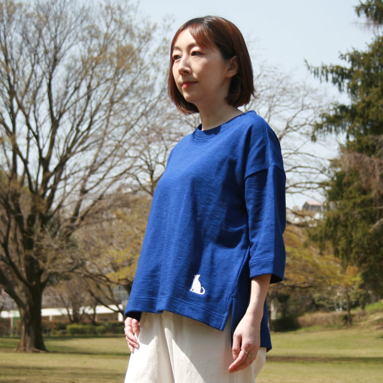 チュラルな質感のオーガニックコットンヴィンテージミニ裏毛で、nekoは何でも知っている 刺繍入り6分袖プルオーバーを作りました。