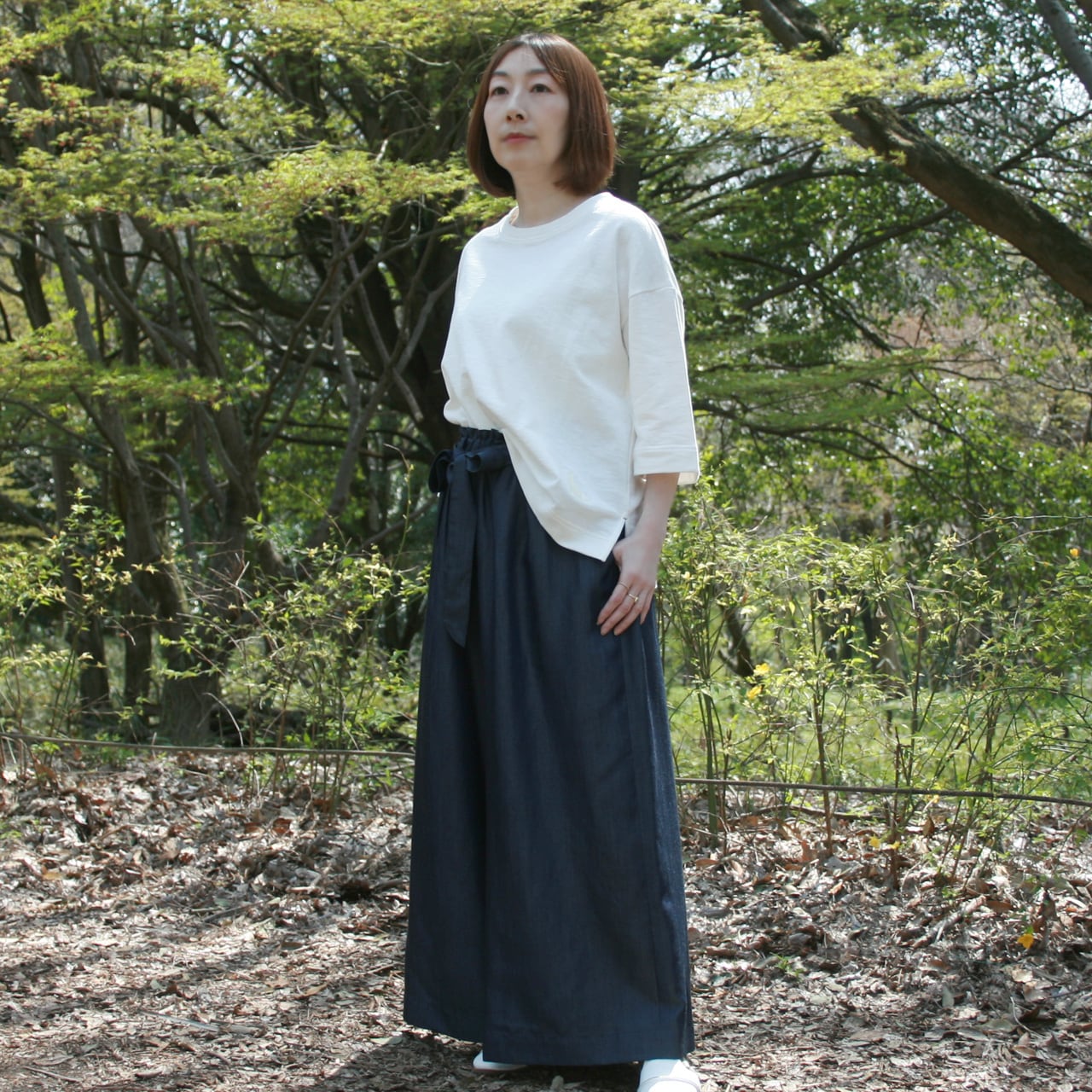 ドロップショルダー、オフボディの身頃の着やすいシルエットで、袖はアームホールゆったりでストレスのない着心地です。